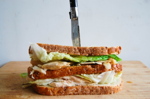 Maak de sandwich af door de kip er over te verdelen en hier weer sla op te leggen. Besmeer de laatste boterham dun met mayonaise en leg deze op de rest. Dat was makkelijk hè? Eet smakelijk!