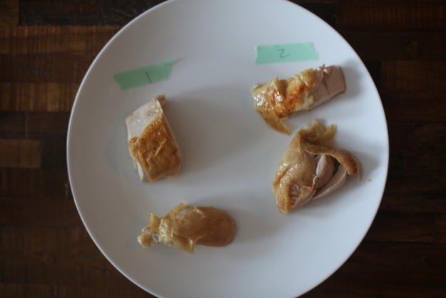 De acht verschillende recepten werden per twee blind verdeeld in ‘wedstrijden’. De kippetjes werden precies bereid zoals het gekozen recept voorschreef, waarna ze blind werden geproefd.