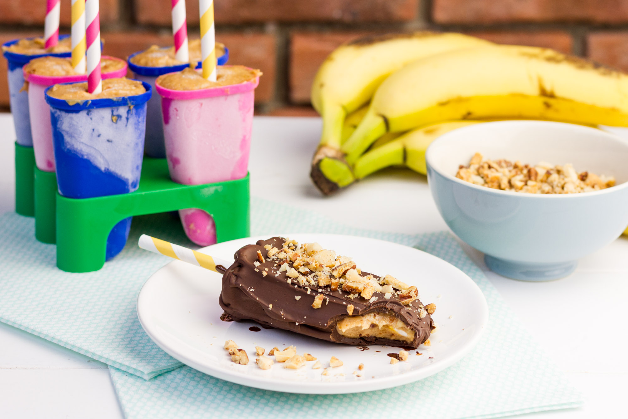 Let op: Pel de bananen en vries ze minimaal 1,5 uur in voor gebruik. Voor dit gerecht heb je een staafmixer en 6 ijsvormpjes nodig.
