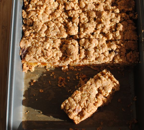 Voor het deeg meng je de havervlokken, suiker, walnoten en zelfrijzend bakmeel in een kom en voeg je de gesmolten boter toe. Roer goed om te mengen. Verdeel de helft over je bakvorm. Druk die goed aan. Dat gaat het beste met je vingers. Lepel dan de abrikozenvulling erover. Sluit af met een laag deeg. Druk even aan. Stukjes abrikoos die niet bedekt zijn worden erg donker in de oven.