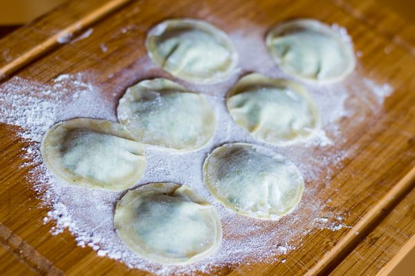 Nu komt het priegelwerk. Snijd rondjes met een glas of ravioli-snijder uit het pastadeeg of de wonton vellen. Kluts de dooier los met een eetlepel water en bestrijk de helft van de deegrondjes met het dooier-mengsel. Leg op de bestreken velletjes een theelepeltje van het spinaziemengsel. Je hoeft echt maar weinig te gebruiken, anders past hij niet dicht.