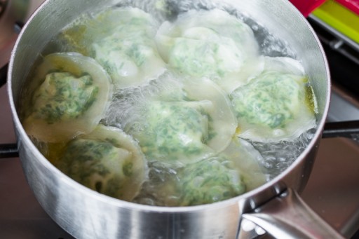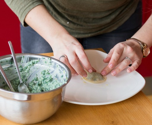 Leg voorzichtig de resterende deegrondjes op de vulling en druk de randjes op elkaar. Voorkom dat je luchtbelletjes krijgt en zorg dat de randjes goed op elkaar aansluiten. Kook de ravioli’s in 4 minuten samen met een flinke snuf zout in het kokende water.