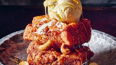 Frituur + ijs + pindakaas = een combinatie waar we bij Culy héél blij van worden. French toast, maar dan next level: gefrituurd, gevuld met mochi-ijs en rijkelijk belegd met vanille-ijs, gezouten cashewnoten en een flinke scheut golden syrup. In Hongkong weten ze wel hoe je een dessert maakt dat je nooit meer vergeet.