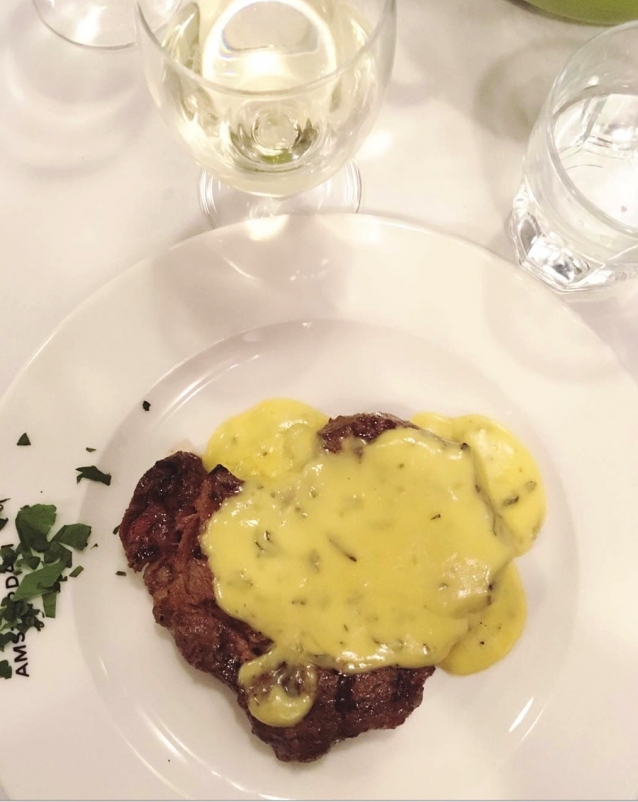 De saus wordt gemaakt op basis van een gastrique, ofwel een reductie van wijn, (dragon)azijn en water, op smaak gebracht met peperkorrels, verse dragon (en andere kruiden) en sjalotjes. Hoe meer aandacht je hieraan besteedt, hoe lekkerder je saus zal worden. Eet smakelijk!