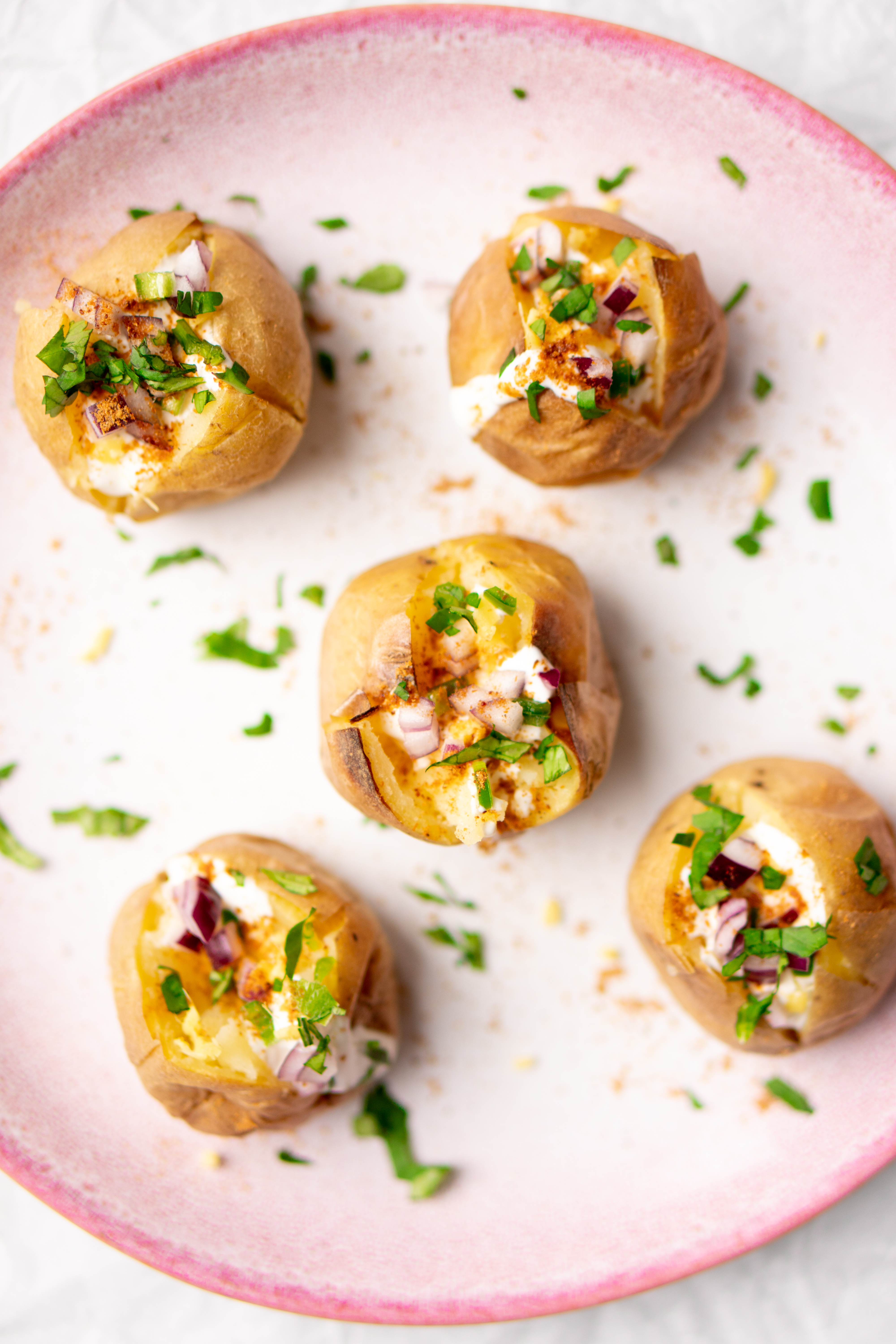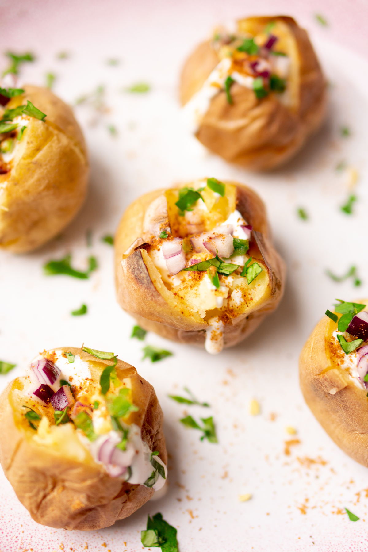 Je hebt vast weleens (vaker) een gepofte aardappel gegeten, maar we durven te wedden dat je nog niet eerder een Indiase gepofte aardappel hebt geproefd! We vullen deze piepers met ondermeer zure room, gember, rode ui en chaat masala: een Indiaas specerijenmengsel.