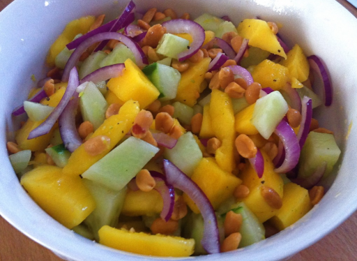 Schil de mango en de komkommer en snijd beide in blokjes. Schil de ui en snijd in dunne halve ringen. Doe de komkommer, mango en ui in een kom en schenk de dressing erover heen. Maak de salade af met de pinda’s.