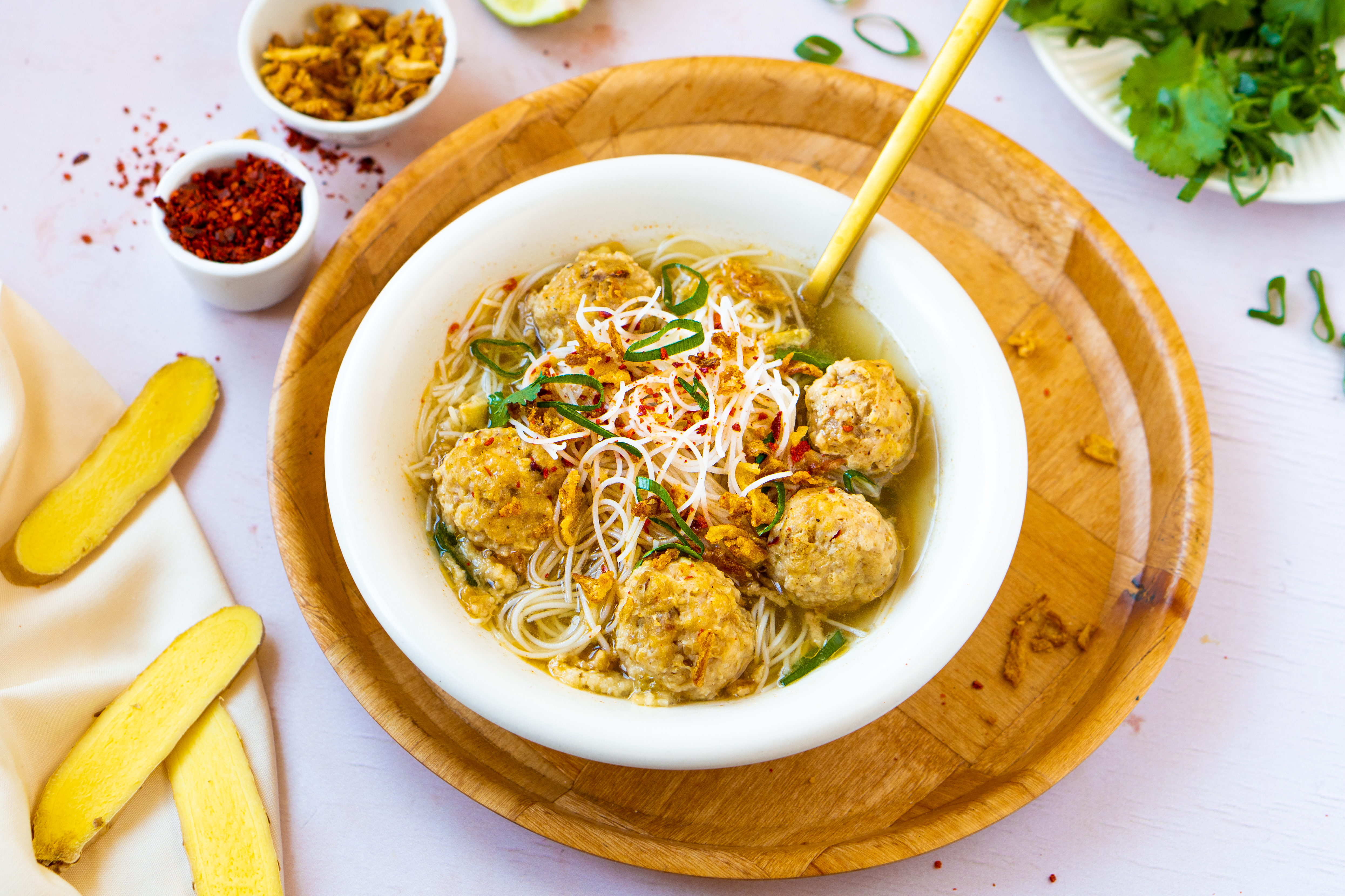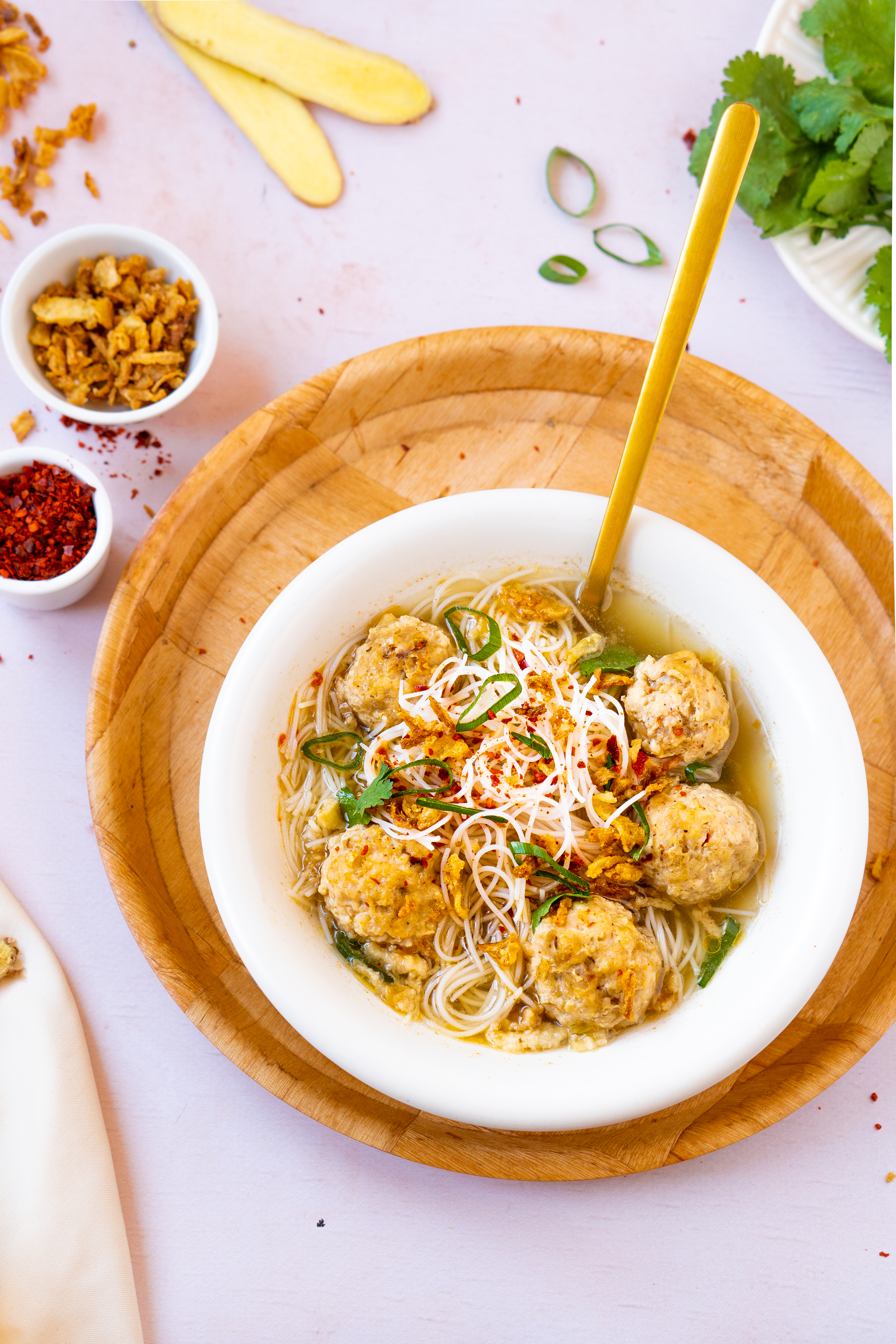 - Schep nu een hoopje noedels in een soepkom en schenk er een deel van de soep over. Serveer met ringetjes bosui, chilivlokken, extra gebakken uitjes en een beetje koriander.