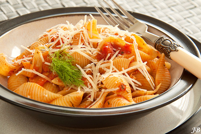 Dit heerlijke recept voor Italiaanse conchiglie met venkel en tomatensaus vonden we op de fijne culinaire blog Carolinesblog. Conchiglie (letterlijk vertaald vanuit het Italiaans: schelpjes) nemen door de vorm perfect pastasaus op. Kun je deze pastasoort niet vinden? Andere pasta zoals kleine schelpjes of buisjes werkt ook prima.