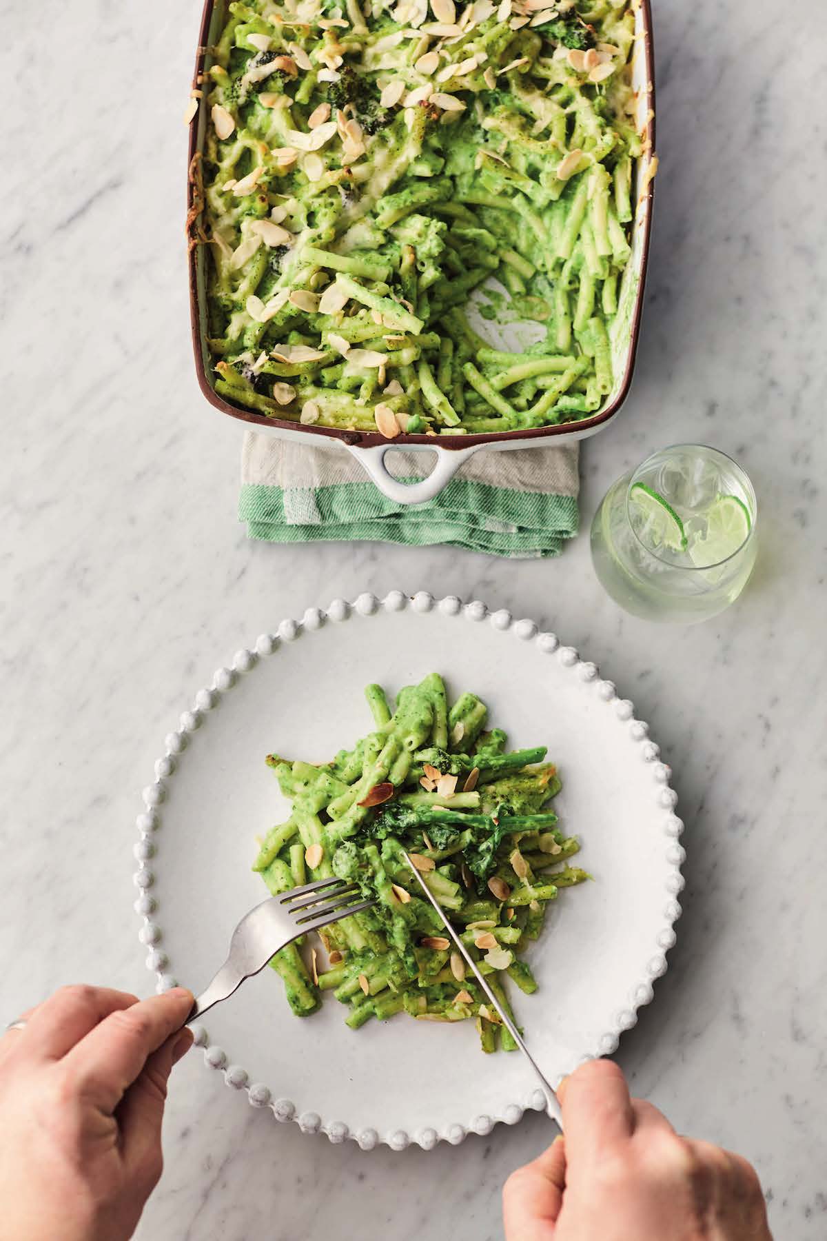 Meer groente eten wordt ineens wel héél leuk en makkelijk met deze mac ’n cheese met groente van Jamie Oliver. Denk aan al het goede van een lekkere mac & cheese, maar dan met prei, broccoli en spinazie (en een funky groen kleurtje). De geroosterde amandeltopping geeft lekker veel crunch aan dit gerecht.