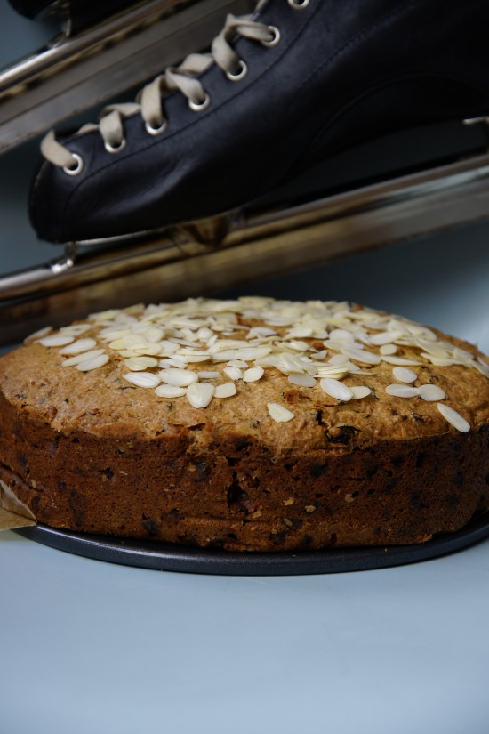 De oven moet je voorverwarmen op 140°C. Alle ingrediënten behalve het amandelschaafsel gaan in een grote kom. Ik meng wel eerst de boter, suiker, eieren, karnemelk, volkoren meel en het bakpoeder. Ik doe wel de rozijnen en krenten op het laatst als verder alles goed gemixed is. Dan gaat het beslag in de vorm die ik met bakpapier heb bedekt. De cake moet 3 tot 3,5 uur bakken. Hij staat er bij mij 3 uur en 10 minuten in. Dat is wel lang als je nog een heleboel moet doen overdag dus met de handleiding zet ik de oven op de timer en kan ik rustig even weg. Eenmaal uit de oven is de cake lichtbruin. Ik laat hem afkoelen en dan doe ik de geschaafde amandelen erop, maar ze blijven niet echt liggen. Daar had ik iets plakkerigs voor moeten gebruiken. De cake is inderdaad stevig geworden en smaakt ook zo. Lekker voor onderweg tijdens een lange schaatstocht of voordat je de kou in gaat.
