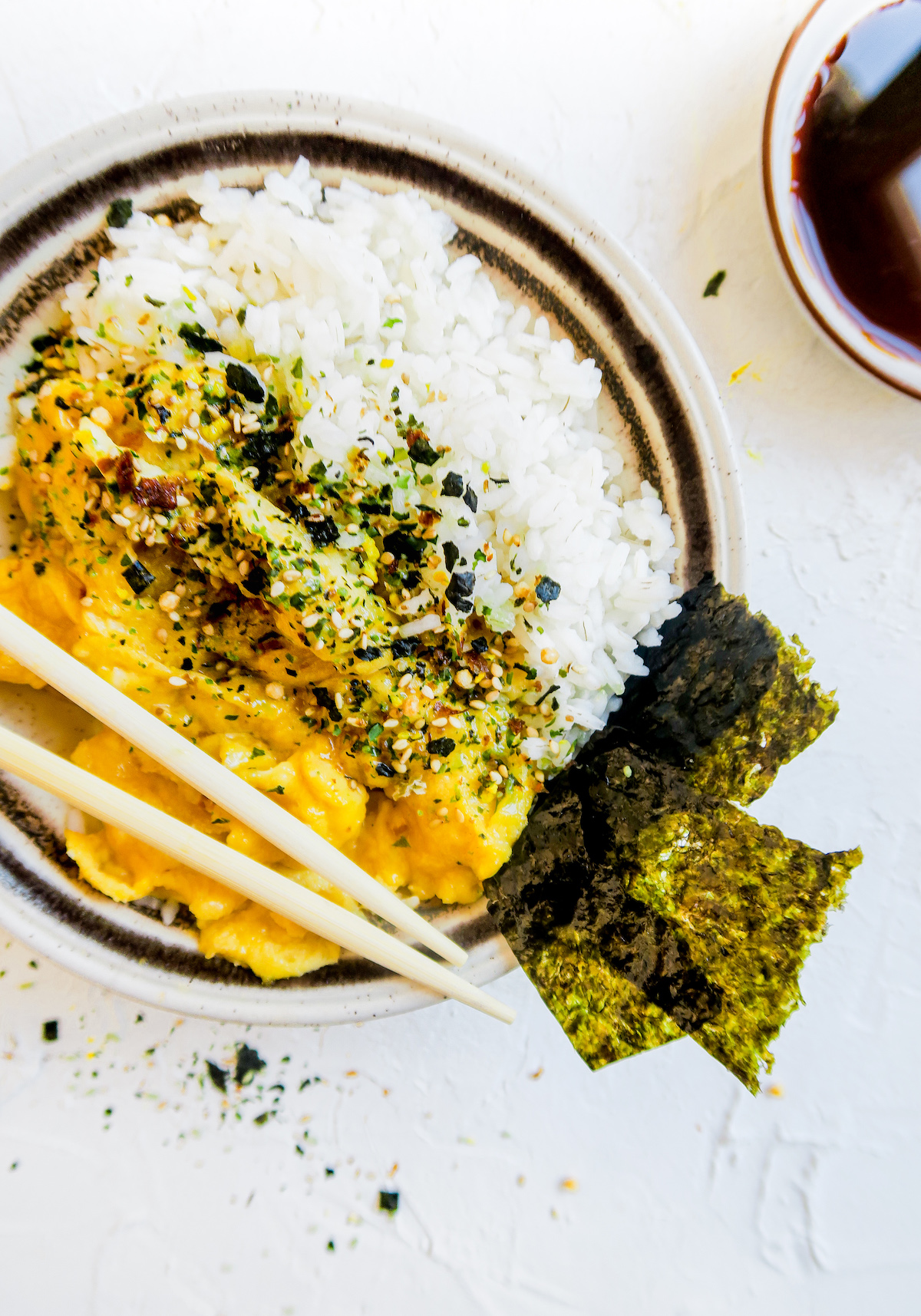 Schep de rijst in een kom, schep de eieren erop en werk af met de furikake en het gedroogde zeewier.