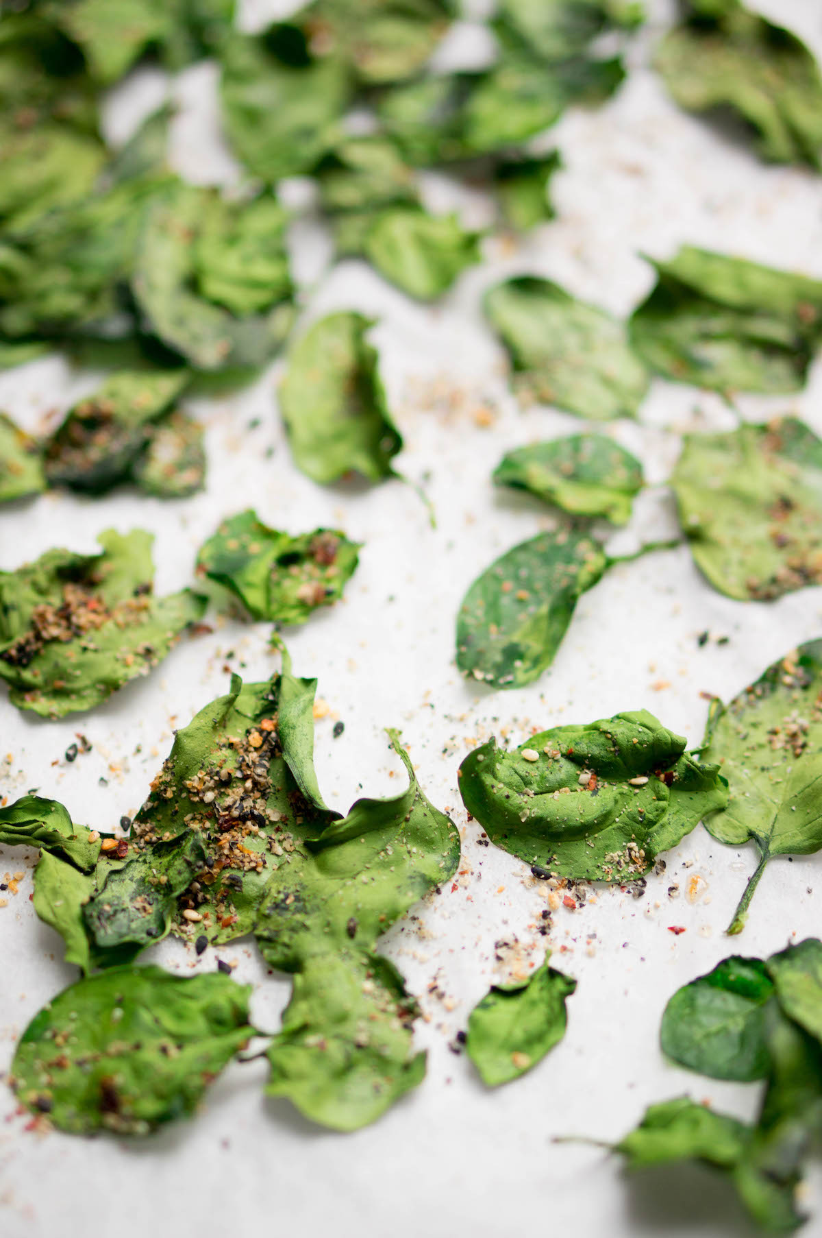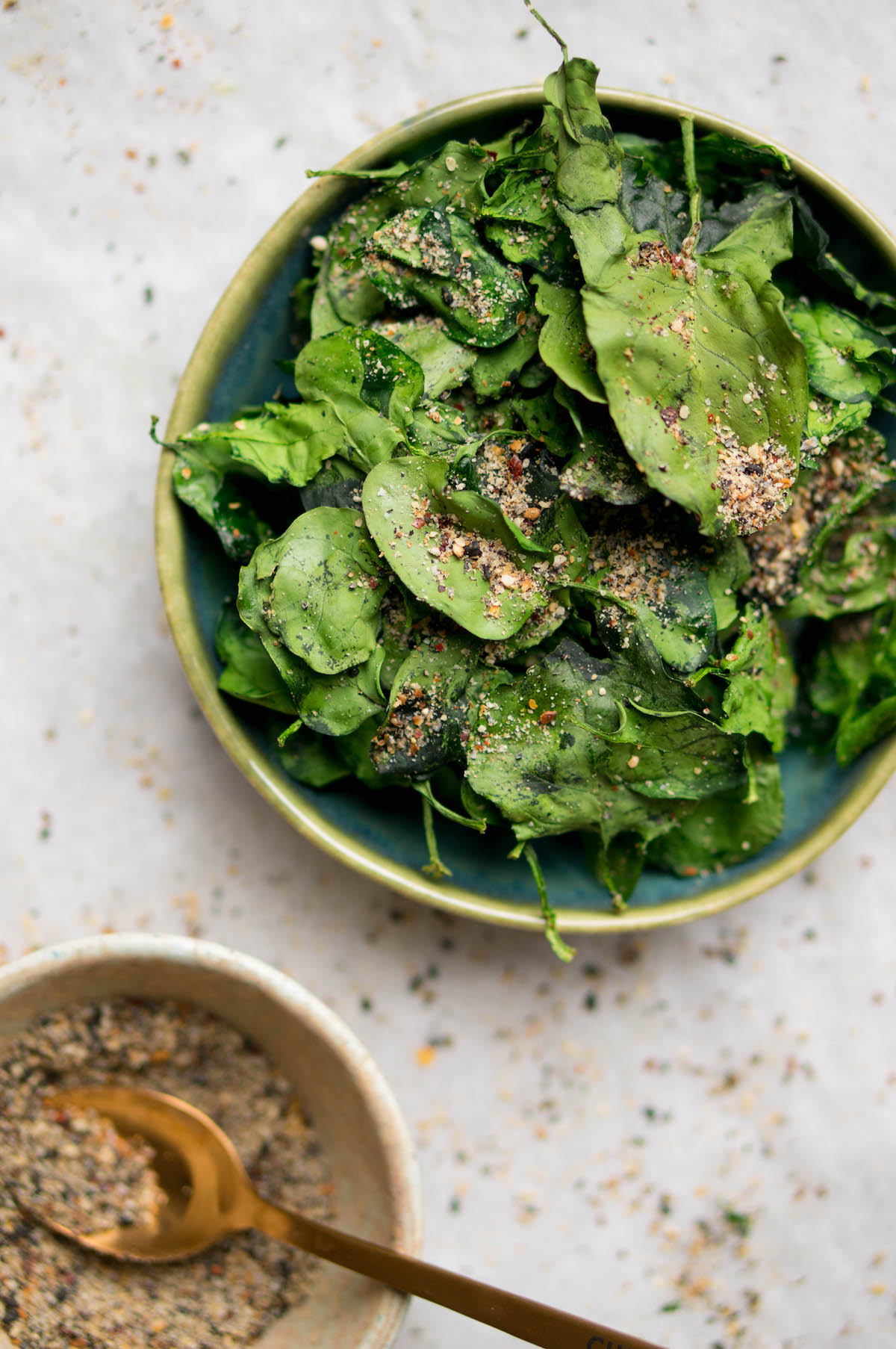 Hussel de spinazieblaadjes met de sesamolie en een eetlepel van het kruidenzout. Verdeel ze in een enkele laag over de bakplaat. Bak ze ongeveer een uur in de oven, tot ze droog en knapperig zijn.