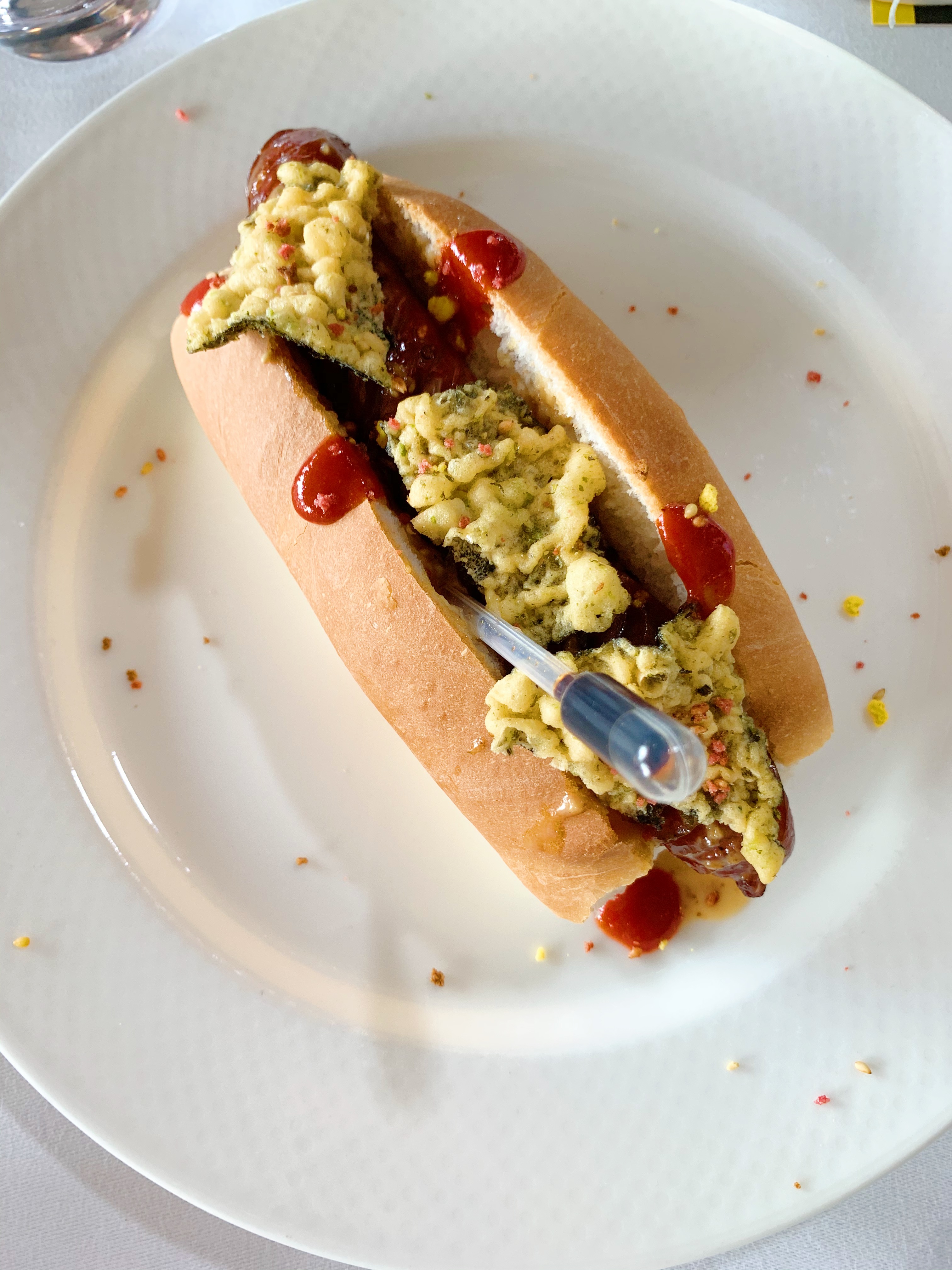De Japanse hotdog van chef Kranenborg bevat naast een hotdogworstje (die de chef trouwens een aantal keer had ingesneden, voor een interessant waaierpatroon) wasabimayonaise, furikake, sesamdressing, Sriracha en krokante nori chips. Deze ingrediënten vind je bij de meeste toko’s. En alvast een waarschuwing vooraf: die nori chips wekken verslavingen in de hand.