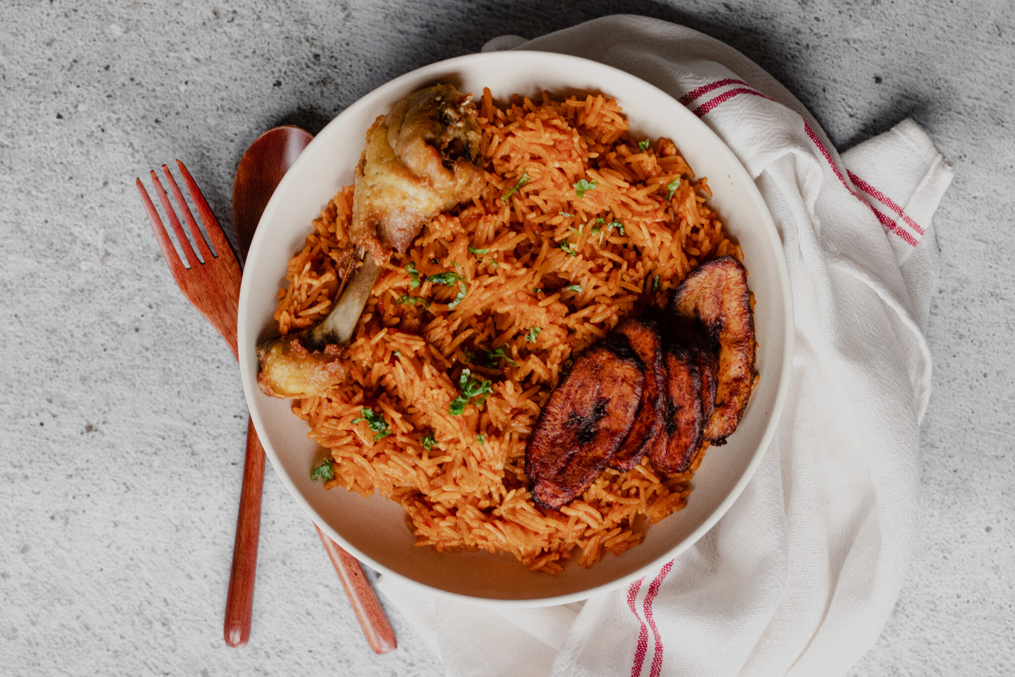 Jollof rice is een Nigeriaans gerecht waarbij rijst gekookt wordt in pittige tomatensaus en wordt gegeten met kip en gefrituurde bakbanaan.