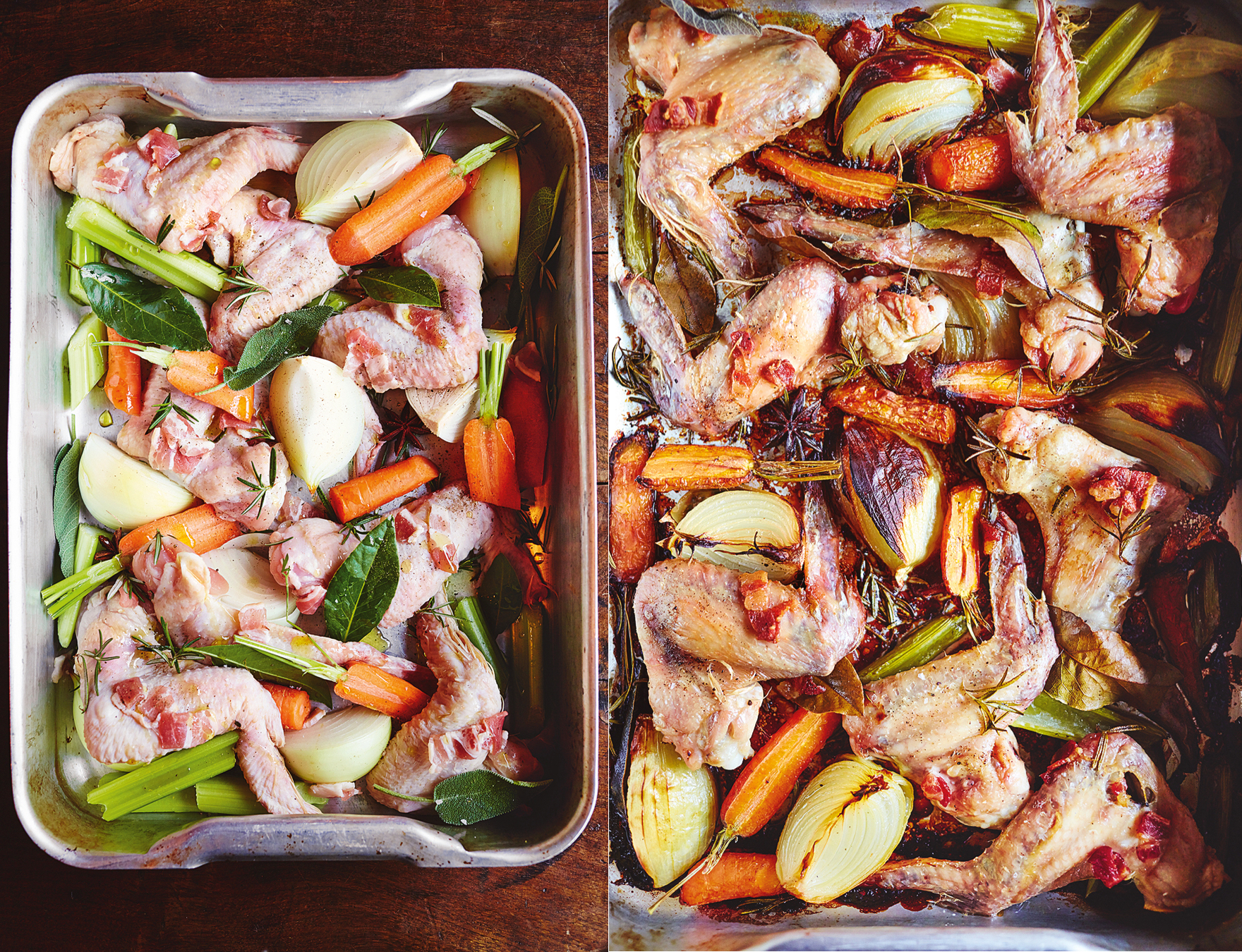 Verwarm de oven voor op 180 graden. Pel de uien, was de wortels en snijd ze met de bleekselderij en bacon in grove stukjes. Doe de groenten, laurierblaadjes, salie, rozemarijn en steranijs in een zware braadslede en strooi er de stukjes bacon over.