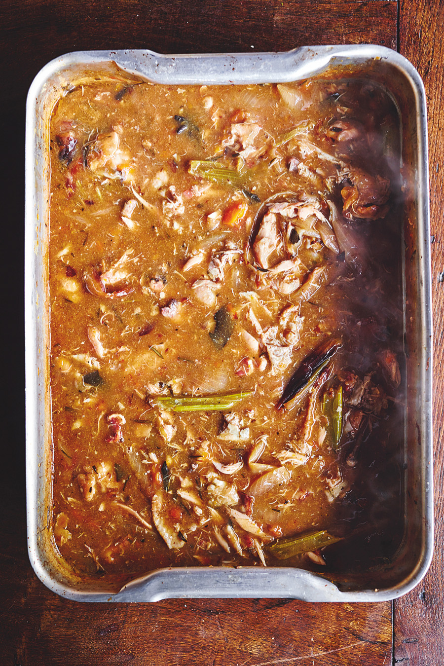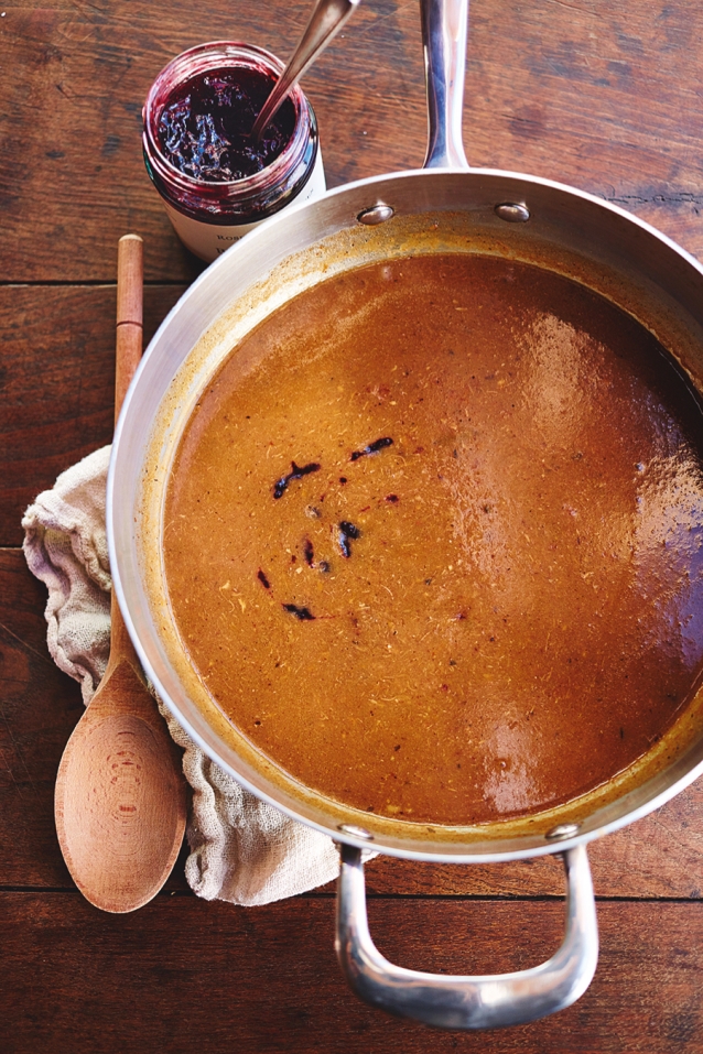 Zet de slede op laag vuur op het fornuis, stamp alles met een pureestamper fijn en schraap de aanbaksels van de bodem los (hoe langer je de boel bakt, hoe donkerder de jus). Als je sherry of port gebruikt, is dit het moment; laat een paar minuten inkoken.