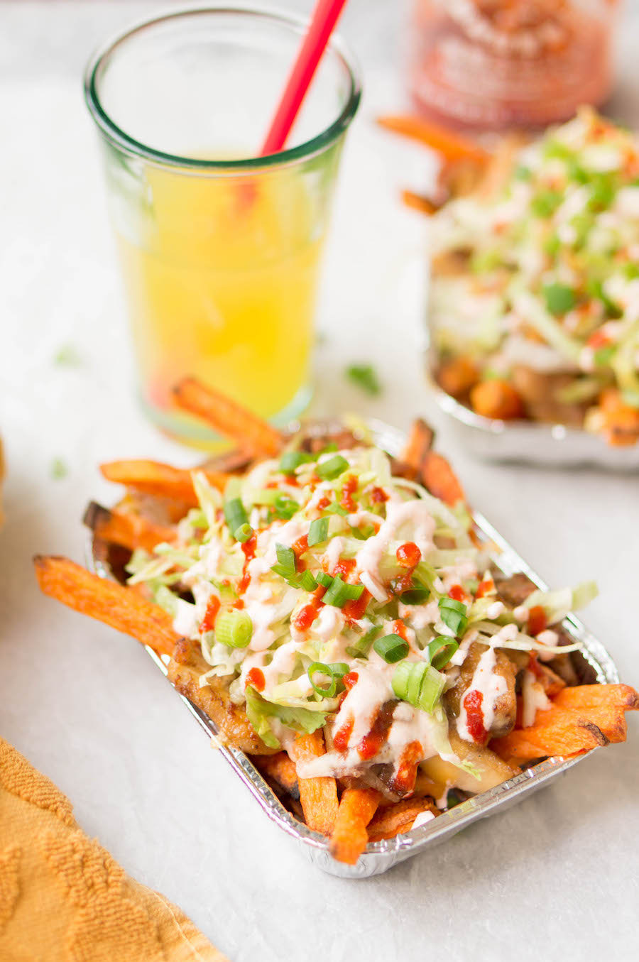 Wie zegt dat een kapsalon altijd een guilty pleasure moet zijn? Het type streetfood dat je alleen bij nachtelijke uren naar binnen schuift, als niemand je ziet? Als je ām zelf maakt en een beetje licht en fris houdt, kun je je homemade kapsalon ook prima als diner verorberen. Wij maakten een gezonde(re) kapsalon met zoete aardappelfriet en kipshoarma.