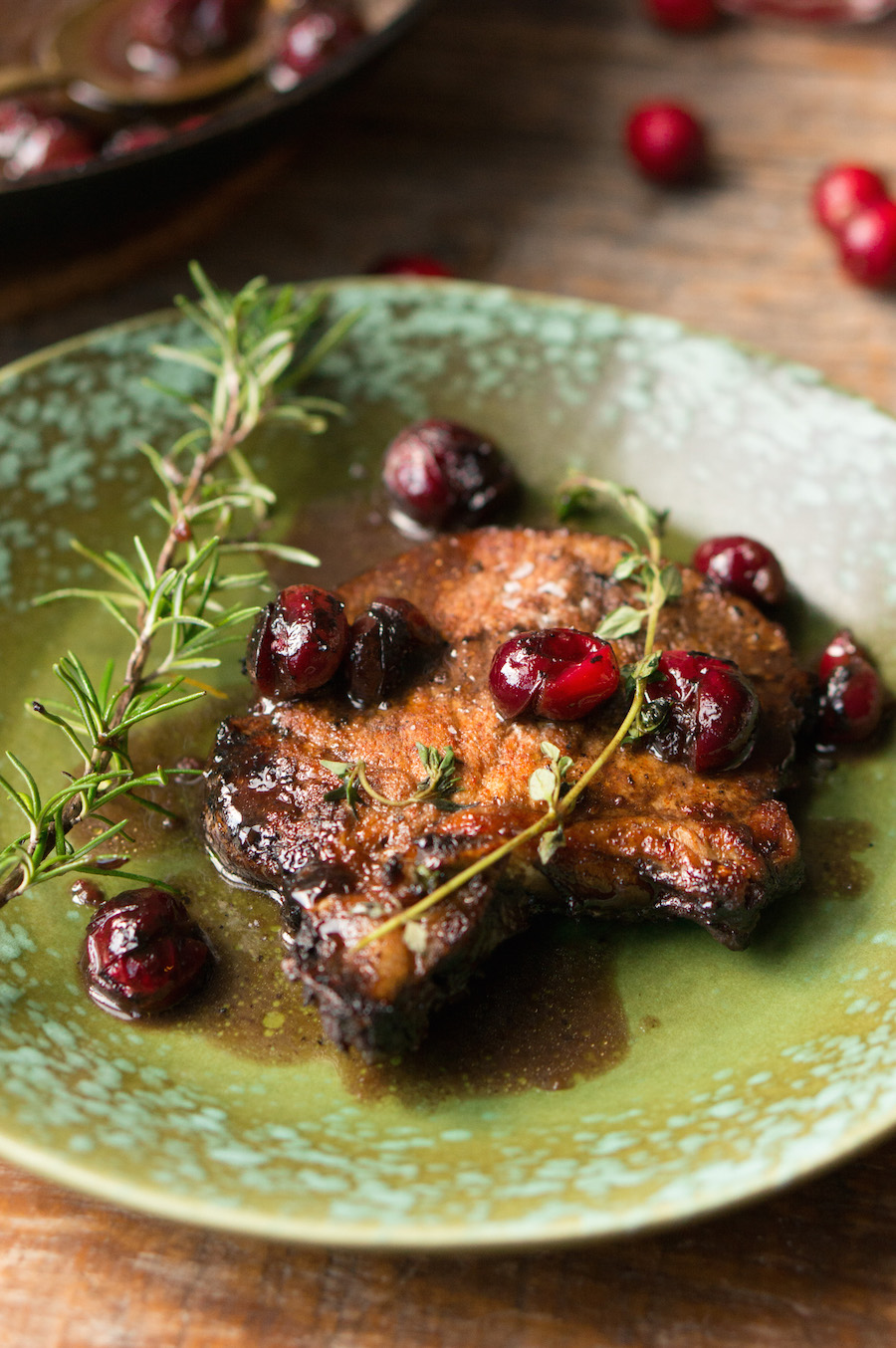 Doe ook de verse cranberryās erbij, de boter, de overige eetlepel bruine suiker en de tijm en rozemarijn. Breng aan de kook en zet het vuur terug naar medium. Doe de karbonaadjes bij de saus in de pan en laat een minuutje warmen.