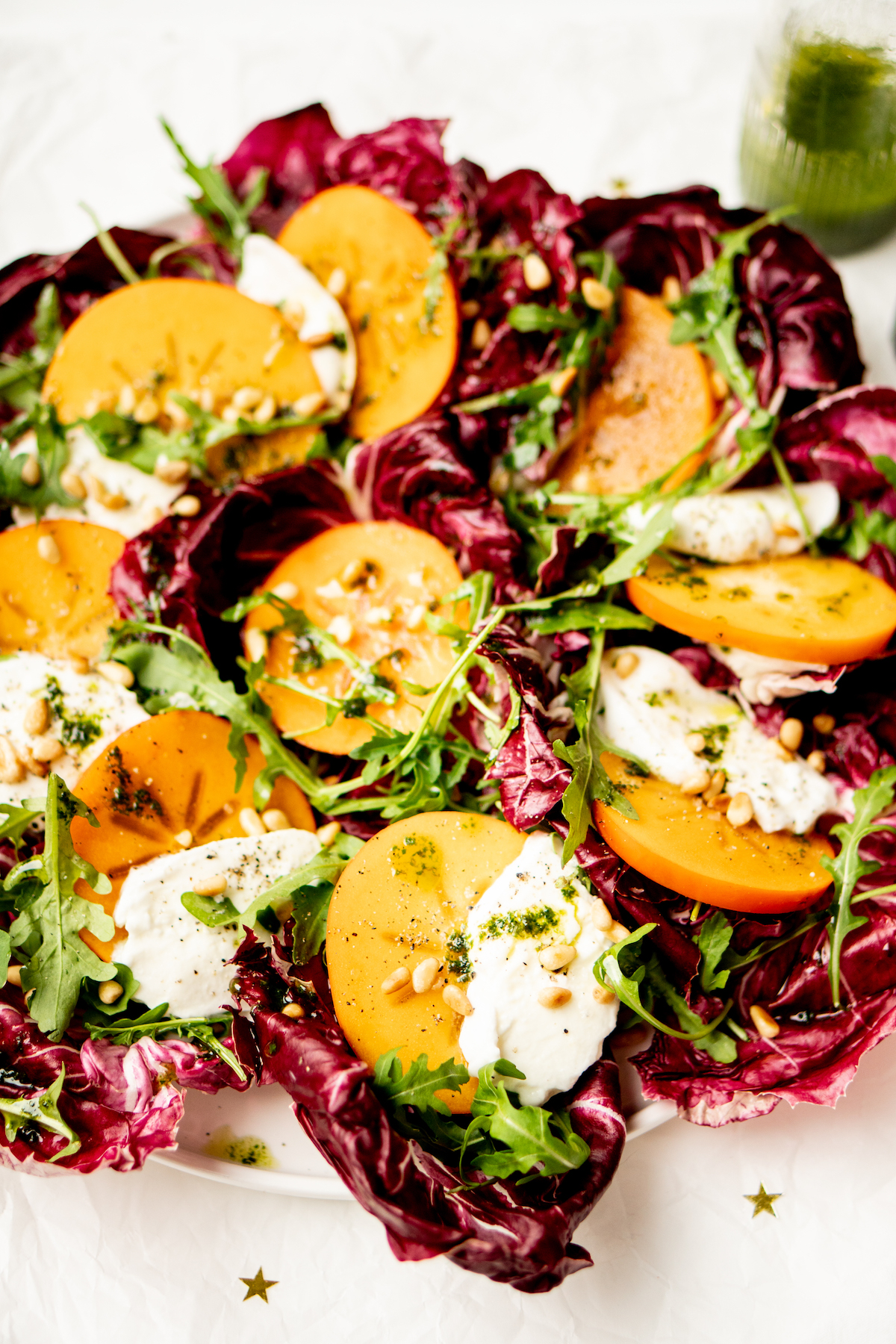 Deze caprese salade bevat een twist: in plaats van tomaten (die rond deze tijd van het jaar natuurlijk niet in het seizoen zijn) gebruiken we kakifruit. Ook wel bekend als sharonfruit. Dus alle Sharons opgelet: dit is dé fruitsoort voor jou. Het maakt van die goede oude caprese ook nog eens feestelijke kerst caprese.