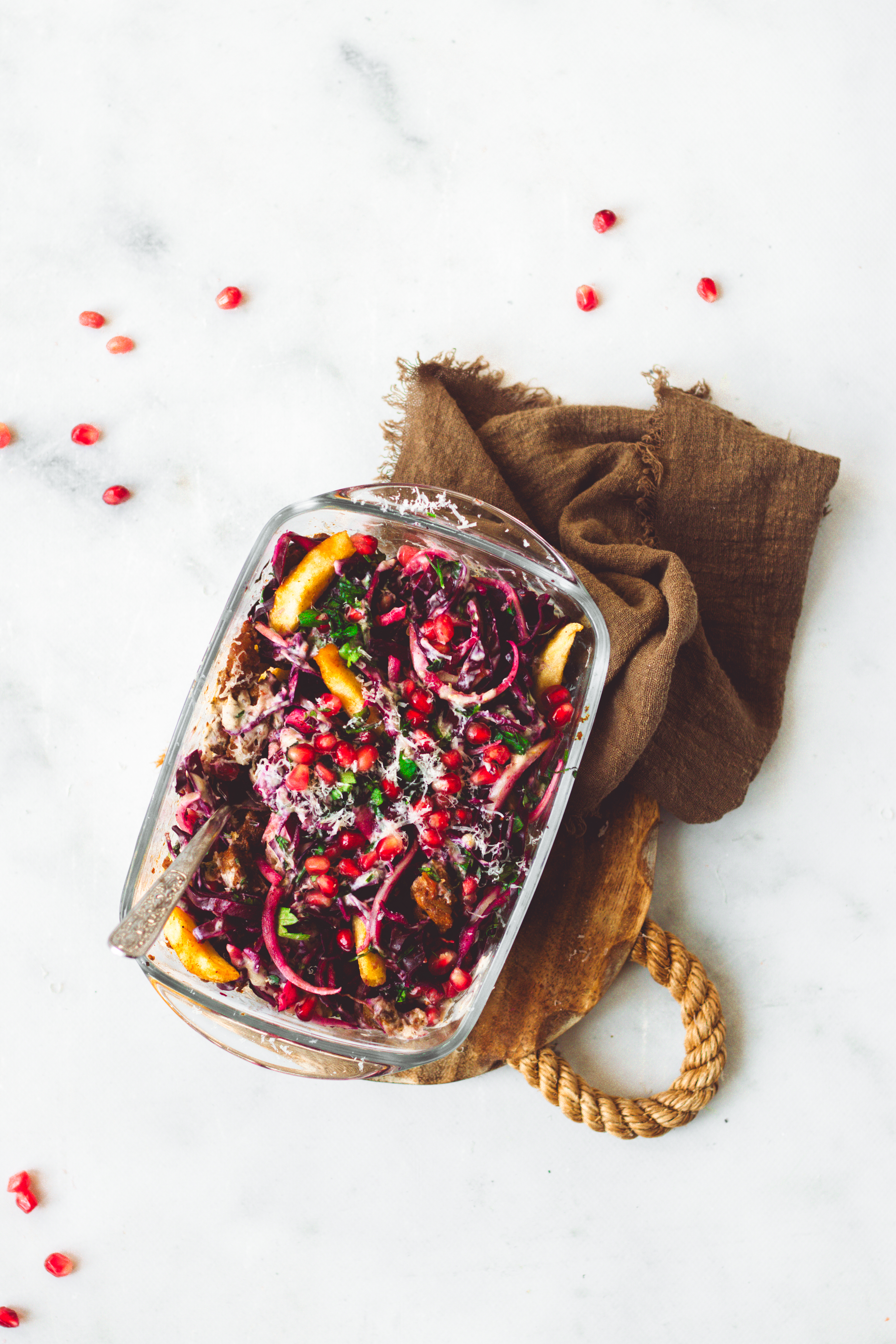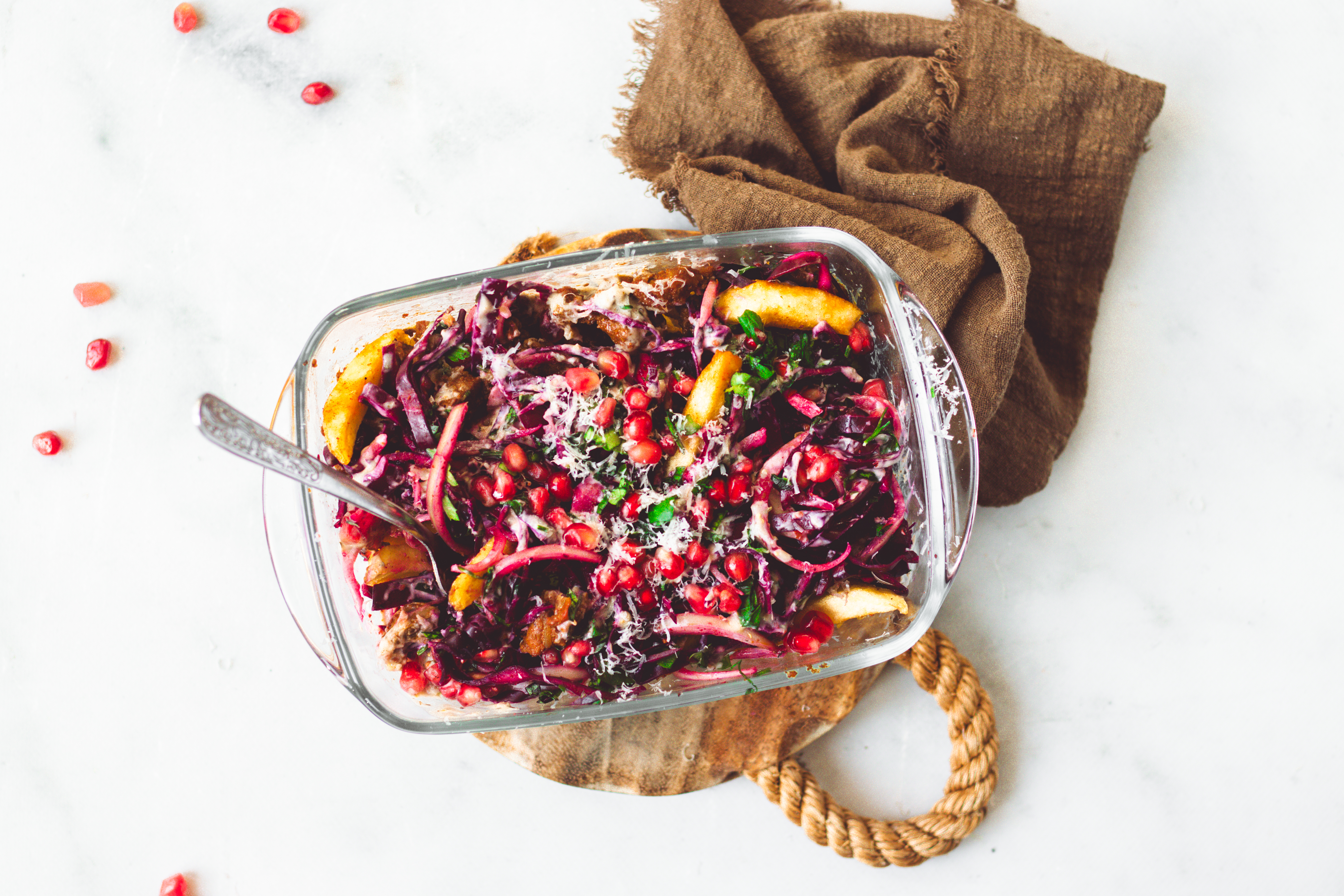 Geen slappe en smakeloze ijsbergsla en waterige tomaat op deze kerstkapsalon, maar een snelle pickle van rode kool met een snuf sumak. Truffel mag niet ontbreken, die gaat door de knoflooksaus. Als laatste stap maken we de kerstkapsalon af met granaatappelpitten en verse peterselie.