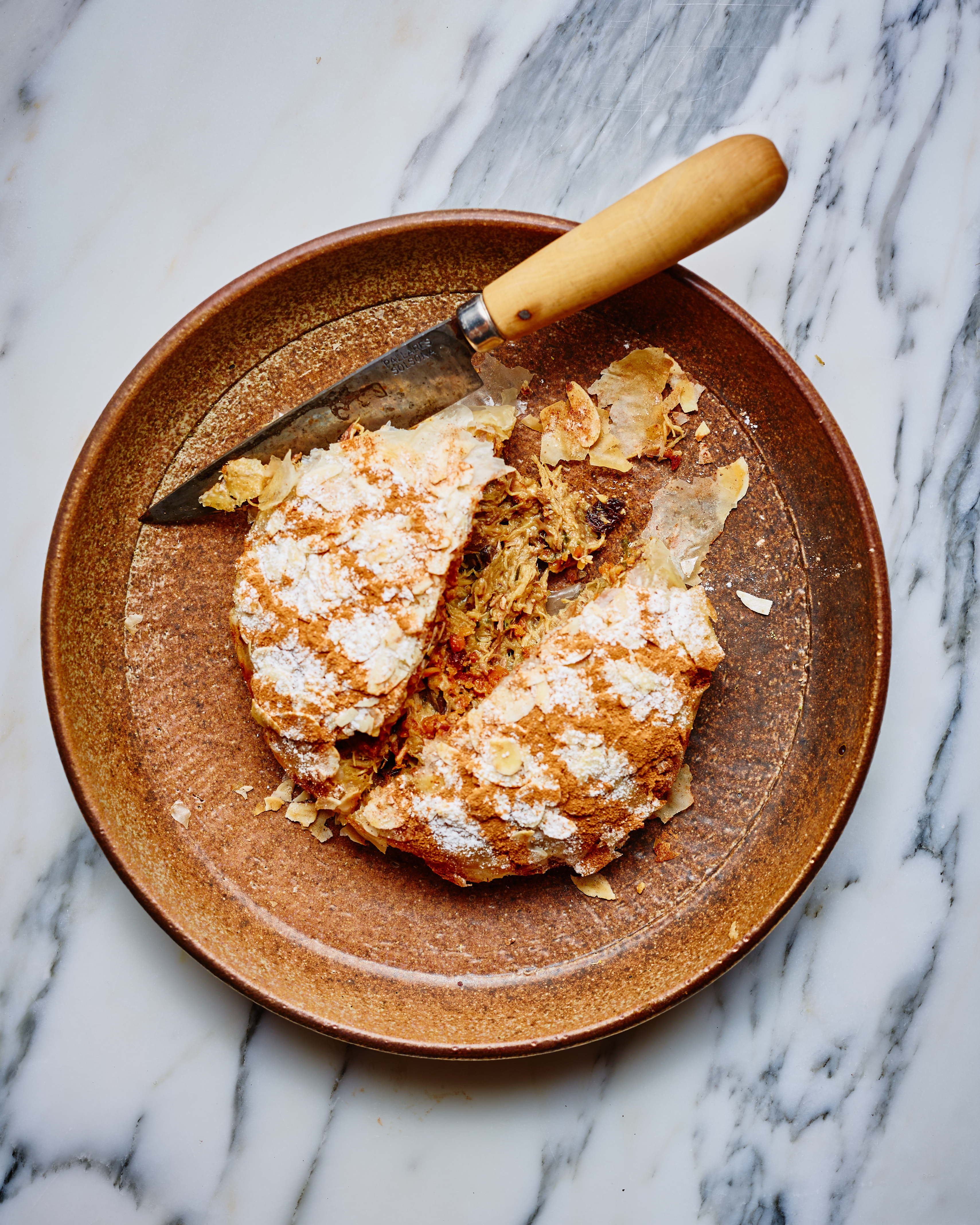 En tip van Mounir: “Eet de bastilla meteen op. Hoe langer hij blijft liggen, hoe minder krokant het deeg wordt.” Dat laten we ons geen twee keer zeggen.