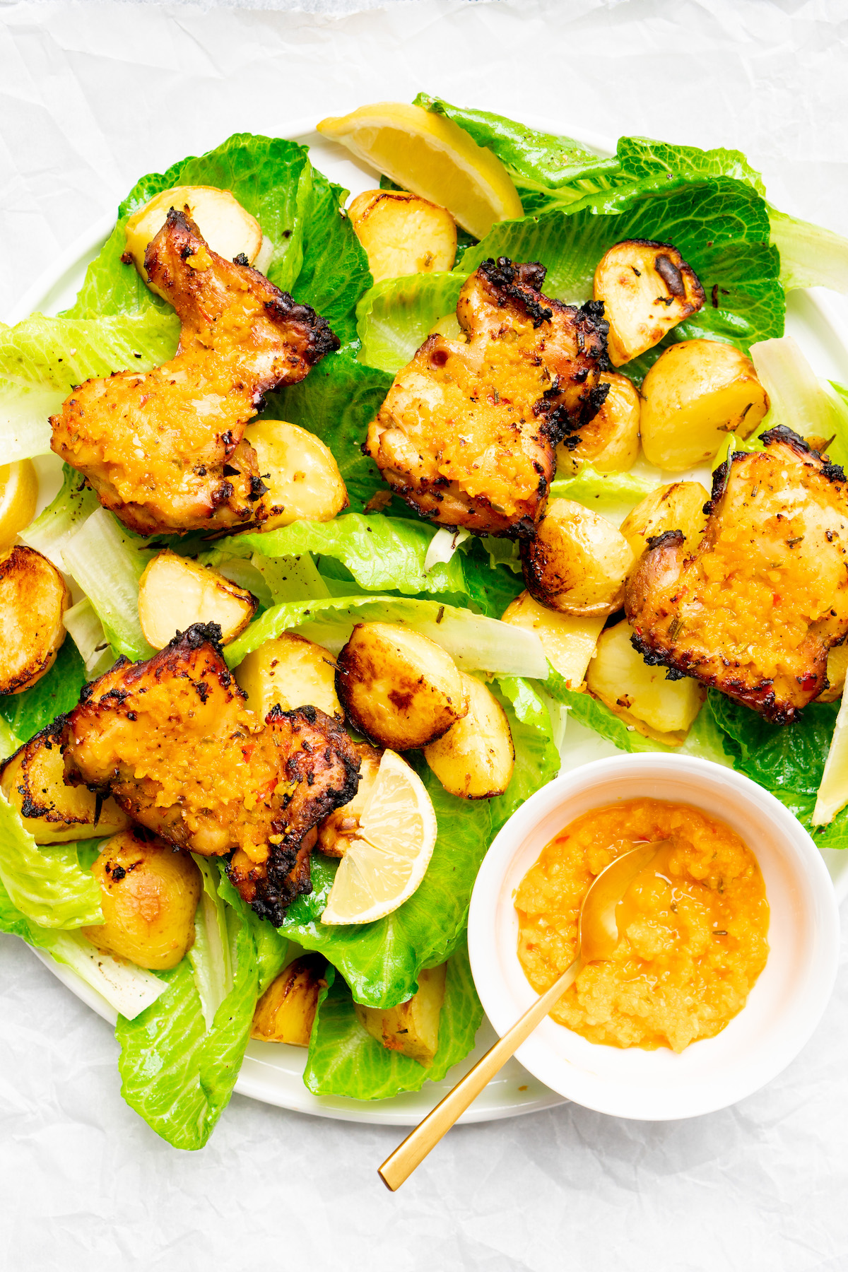 Voor deze kip piri piri schotel mag je gewoon lekker alles op één grote schaal serveren: een simpele salade, goddelijke gebakken aardappeltjes en kippendijen in een spicy marinade. Een makkelijk en snel recept – en daar houden we van!