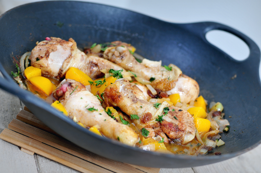 Voeg de blokjes perzik en rozijnen toe en laat nog even inkoken zonder deksel op de pan. Dit duurt ongeveer drie minuten.Ā Controleer op de kip gaar is en serveer!