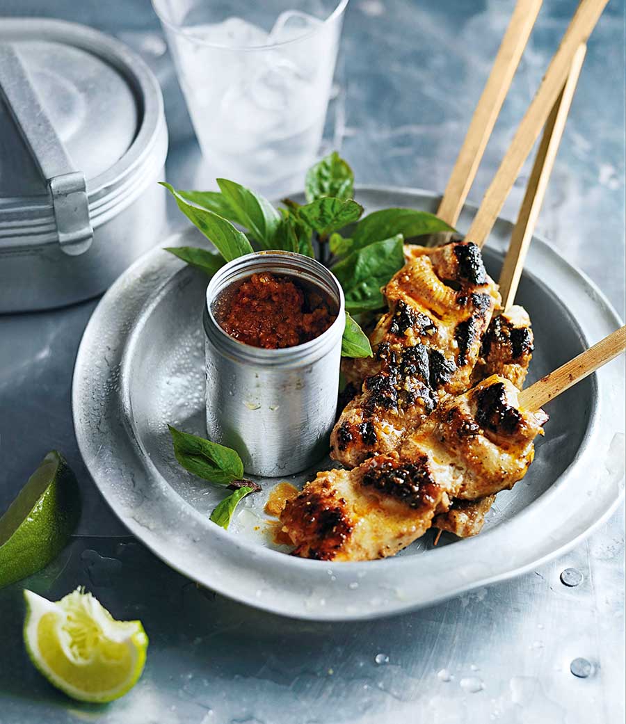 Verhit op hoog vuur een grillpan (of barbecue). Rijg de kip aan de prikkers, bestrijk met olie en gril 3-4 minuten aan elke kant of tot het vlees gaar en goudbruin is. Dien de kipspiesen op met de andere helft van de pindasaus en met basilicumblaadjes en limoen.