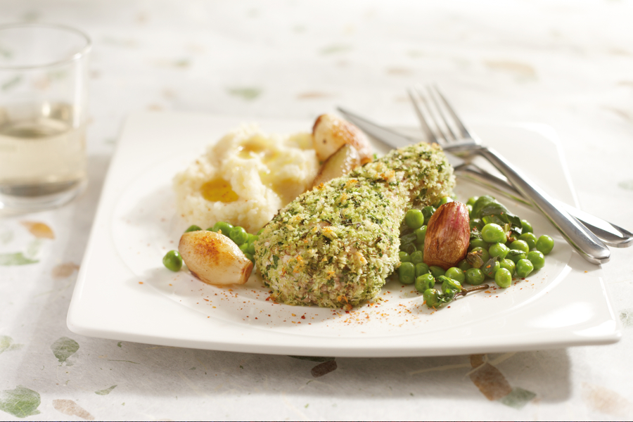 Maak een grove aardappelpuree en kook de doperwtjes in een beetje water met zout bijna gaar. Bak de fijngesnipperde sjalotten in een druppel olijfolie en blus de sjalotten af met de rode wijn. Laten inkoken en de bouillon toevoegen. Weer laten inkoken totdat er net genoeg over is voor de saus. Super krachtig van smaak en weinig calorieën. De simpele stamppot van aardappel, de verse doperwten en de kip met de krokante korst zijn ideaal voor een eerste lente dag. Geniet van de smaak!