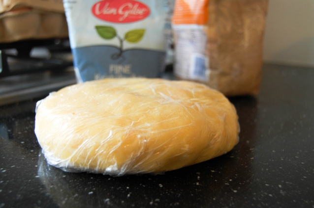 Doe alle ingrediënten voor het deeg (behalve het tweede ei) in een kom en kneed dit met je handen tot een egaal deeg. Maak er een platte schijf van en doe dit in vershoudfolie, laat het een half uur rusten in de koelkast.