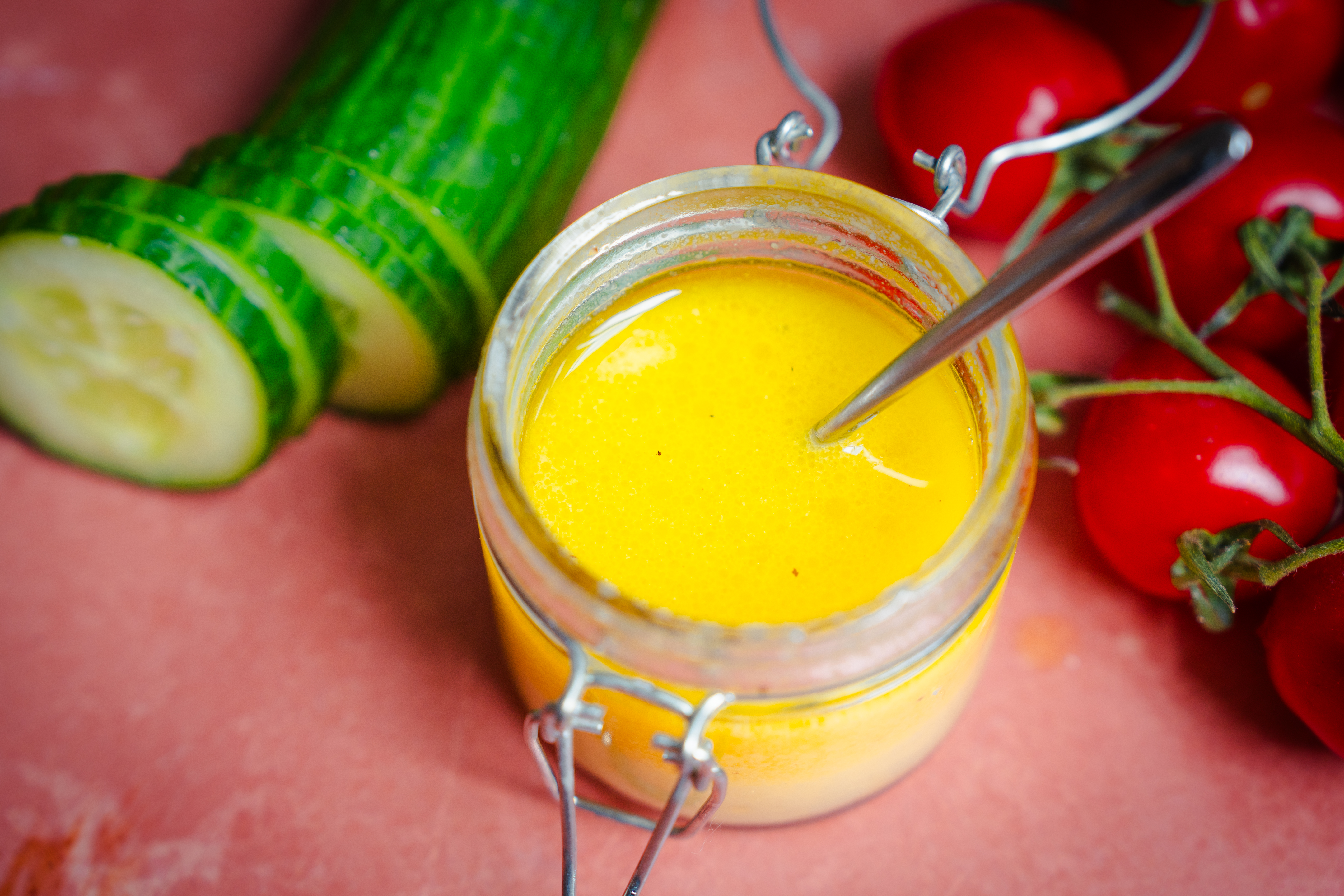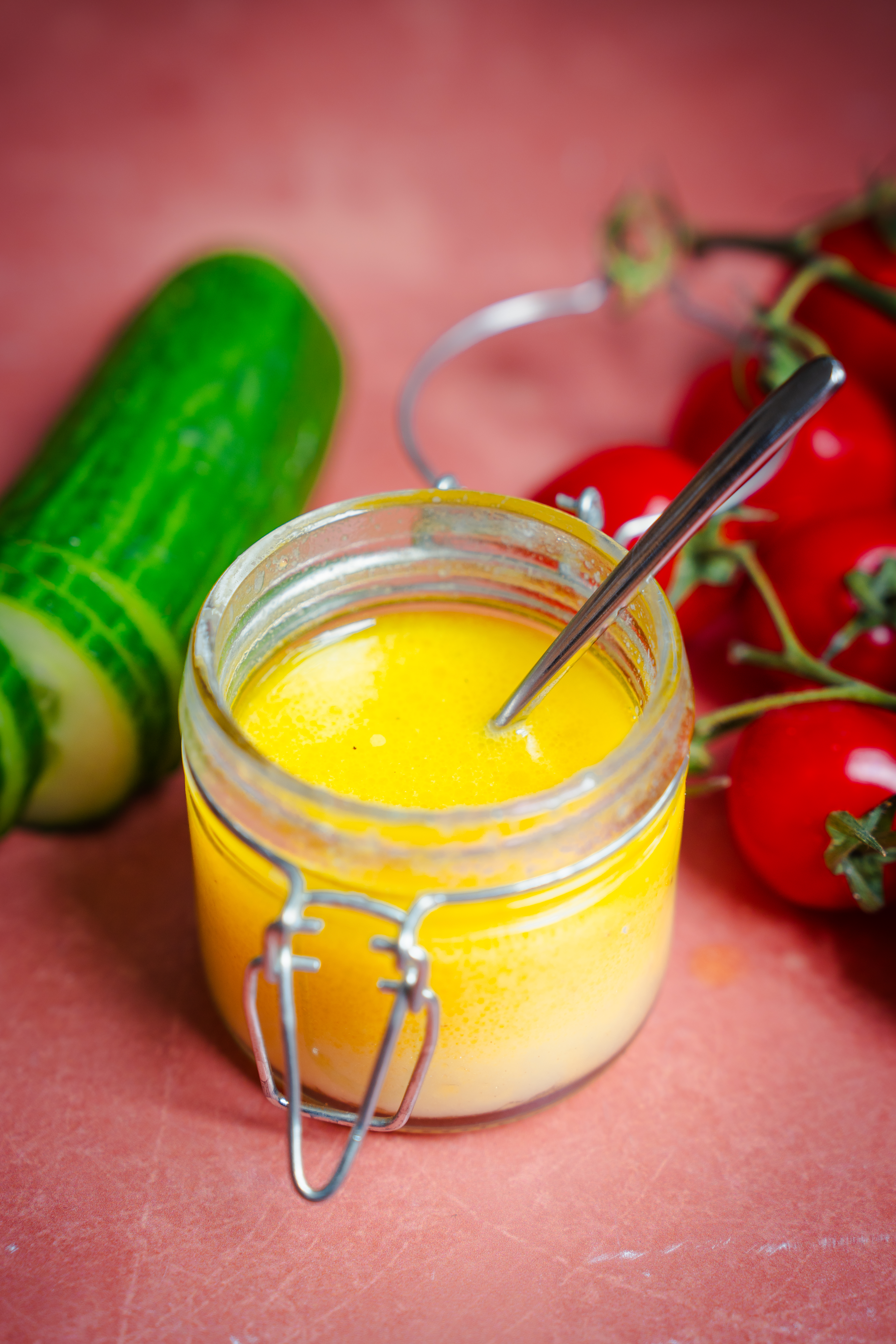 - Tijd om te proeven. Moet er nog iets bij? Meer azijn, meer zout? Voeg beetje bij beetje toe en blijf goed kloppen totdat ‘ie perfect op smaak is.