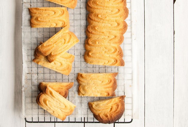 Bak de koekjes in 20 minuten goudgeel en gaar. Snijd de deegrepen direct uit de oven (als het nog goed warm is) in stukjes van 5 cm. Laat afkoelen.