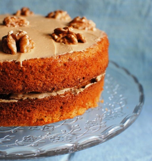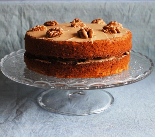 Als de cake helemaal is afgekoeld smeer je met een paletmes de helft van de botercrème op de onderste cake, dan de volgende cake erop en de rest op de bovenkant smeren. Versier met walnoten, koffieboontjes of iets anders toepasselijks.
