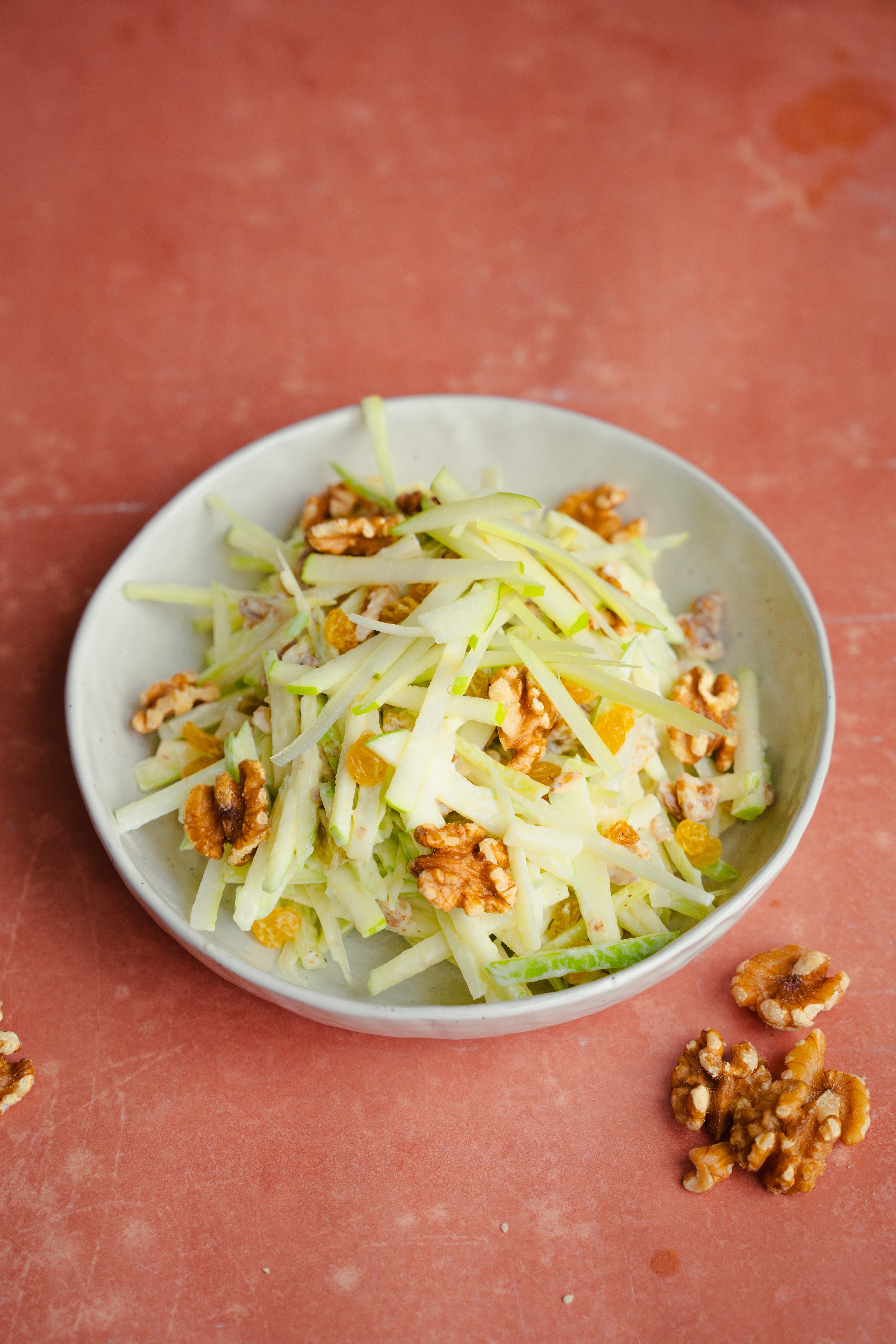 De waldorfsalade is een echte klassieker en raakt eigenlijk nooit uit de mode. Traditioneel gemaakt met bleekselderij, appel, walnoten en mayonaise, maar tegenwoordig wordt hij ook vaak geserveerd met rozijntjes en een beetje citroensap.