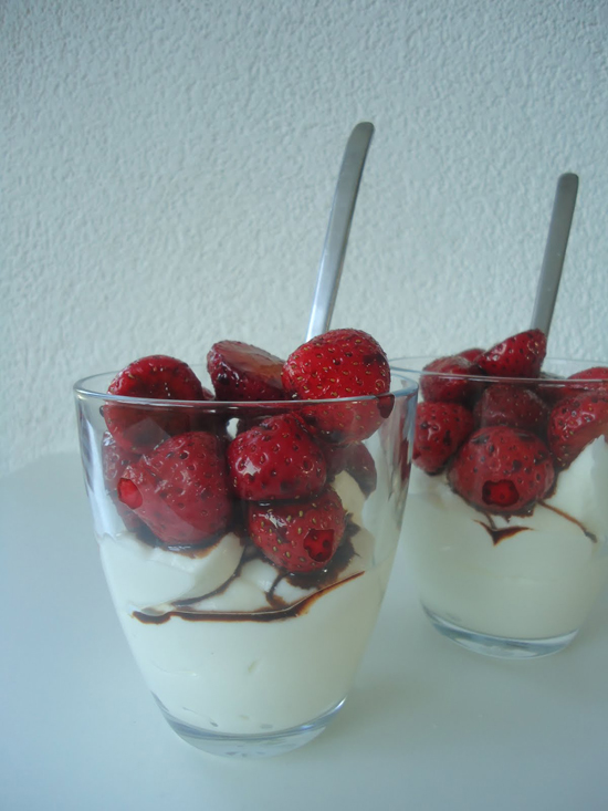 Maak nu de aardbeien schoon en marineer deze in de balsamico. Doe de hangop in een glaasje en leg de aarbeien er op.Ā Nu is het genieten geblazenā¦
