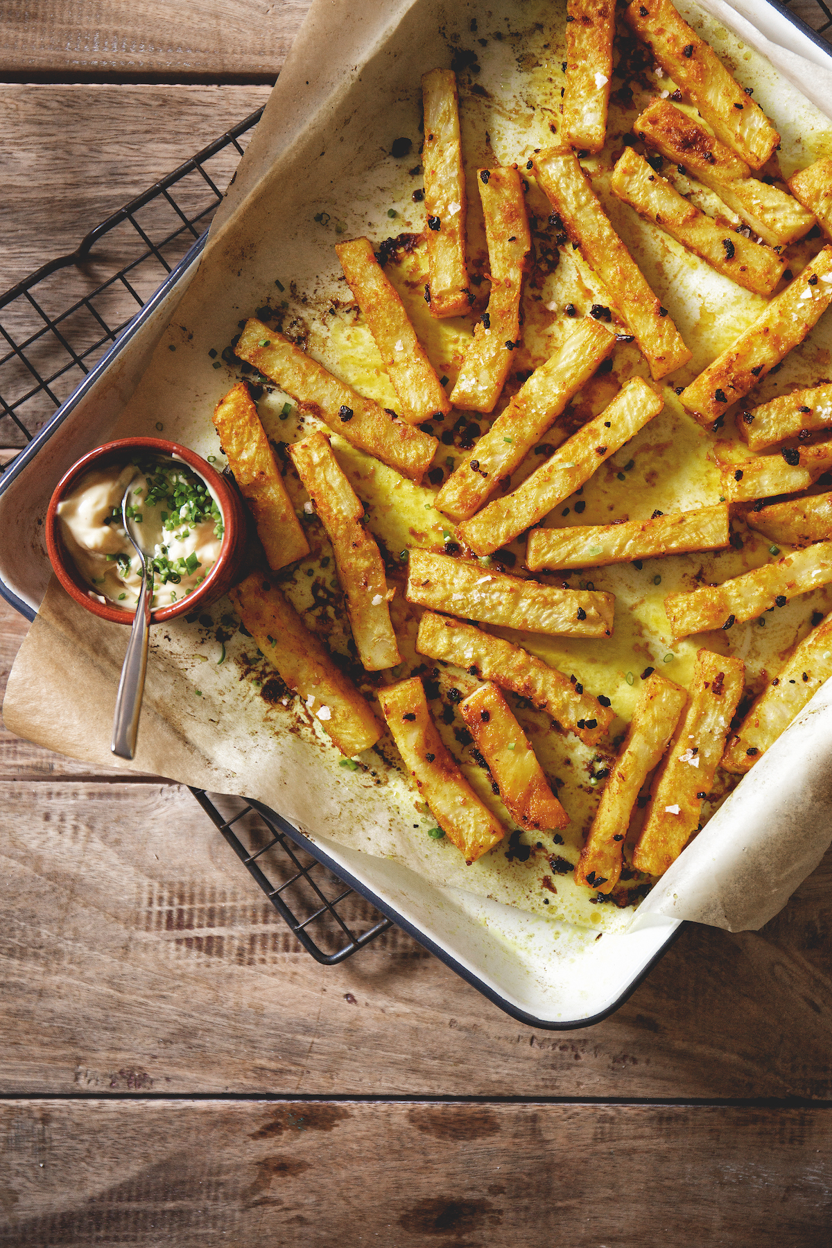 Knolselderij laat zich perfect verwerken tot frieten en om het ook nog gezond te houden, bakken we de friet in de oven!