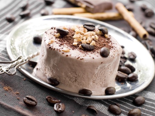 Snijd dikke plakken of maak quenelles. Serveer de koffie semifreddo met mokkaboontjes en een snuf cacaopoeder.
