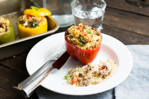 Gevulde paprika met couscous, gekruid gehakt en feta