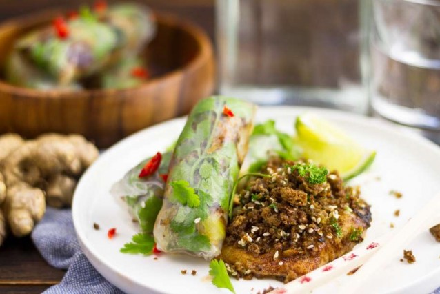 Kabeljauw met wasabicrumble en vegetarische spring rolls