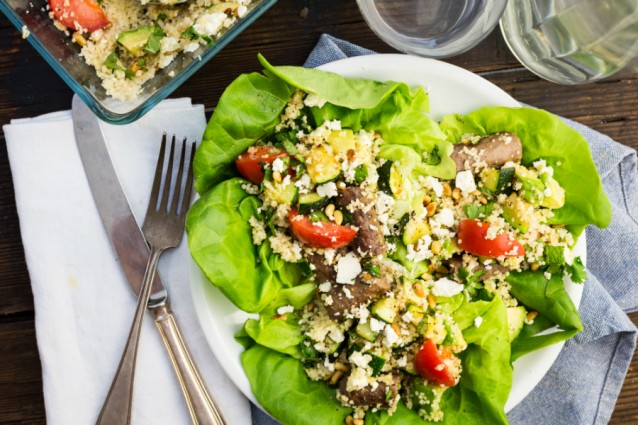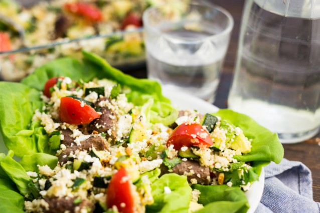 Haal grote bladen van de kropsla, verdeel deze over de borden en schep de couscoussalade hierin. Eet smakelijk!