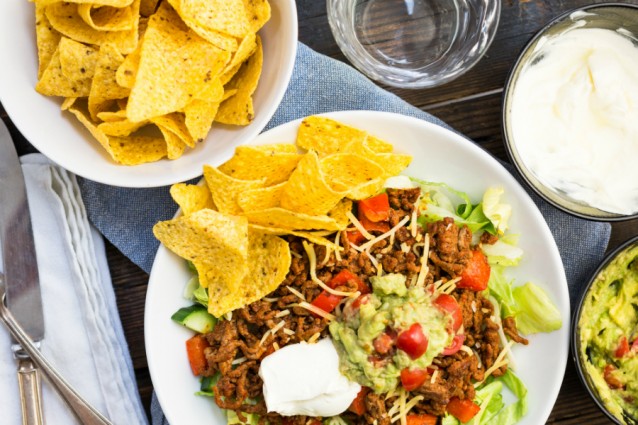 Meng de ijsbergsla en komkommer en verdeel dit over de borden. Schep het gehaktmengsel hierover. Serveer met de crème fraîche, guacamole en tortillachips. Eet smakelijk.