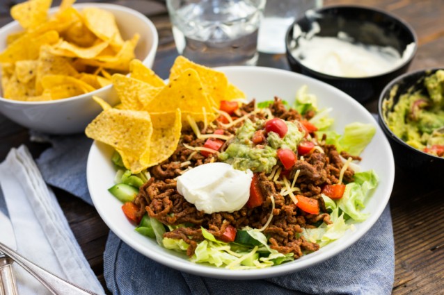 Mexicaanse gehaktschotel met guacamole en crème fraîche
