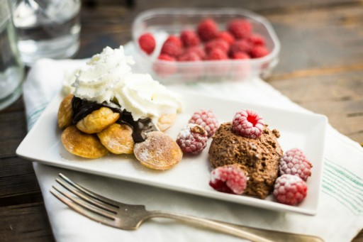 Verdeel de poffertjes over vier borden, schenk hierover de chocoladesaus en spuit een toefje slagroom op de top. Verdeel de chocolademousse aan de andere kant van de borden en strooi hierover een aantal frambozen.