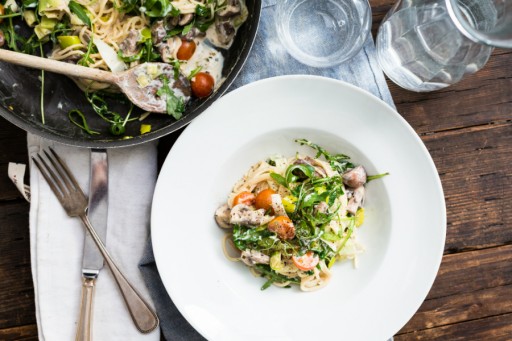 Dit recept is simpel en perfect voor een doordeweekse dag: romige spaghetti met prei en champignons.