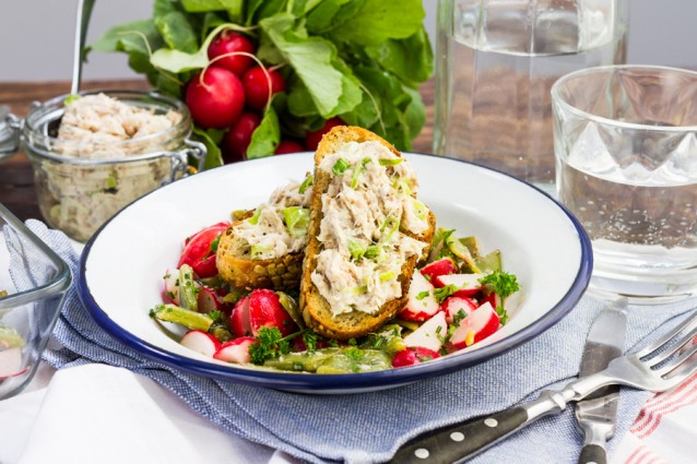 Snijbonensalade met gerookte makreel op toast