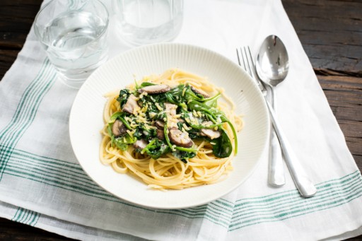 Dit recept is simpel en perfect voor een doordeweekse dag: spaghetti met verse spinazie en champignons.