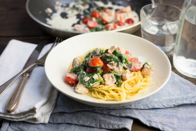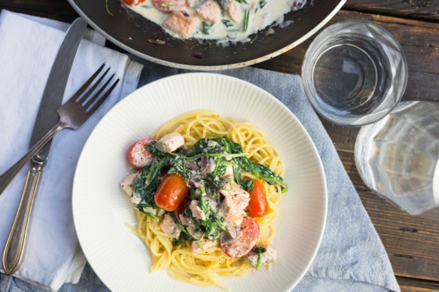 De perfecte doordeweekse pasta: romige spaghetti met zalm en spinazie