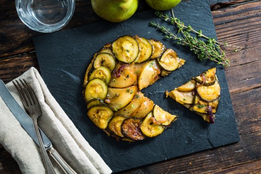 Hartig meets zoet: tarte tatin met courgette en peer.