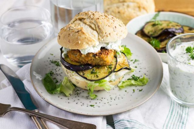 Dit recept is simpel en perfect voor een doordeweekse dag: vegetarische burgers met aubergine en tzatziki.