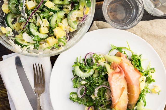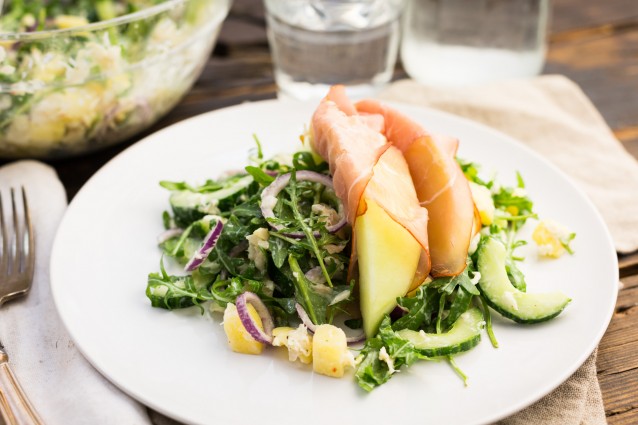 Verdeel de salade over vier borden en serveer er de meloen met rauwe ham bij. Eet smakelijk!
